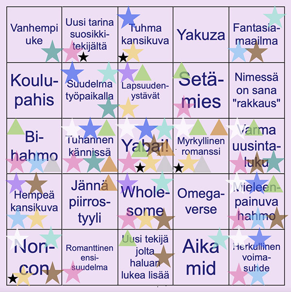 Mielestäni on aika hauskaa, että Inside Full Bloom ja sen sivuhahmoista kertova paljon valoisampi No Doubt Lilac (jonka osumat näkyvät bingokortissa violeteilla tähdillä) eivät osuneet bingossa yhteenkään samaan ruutuun. Tämä kertoo aika konkreettisesti siitä, miten täysin eri maailmoista niiden tarinat ja dramaattiset tyylit ovat yhtenäisestä maailmasta ja hahmokaartista huolimatta.