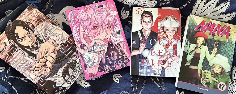 Hassuinta harrastamisessani ehkä on, että suurinta herkkuani ovat rauhaisat vapaapäivän aamupäivät, jolloin voin lukea vuorotellen luvun kerrallaan 3-5 eri sarjaa – mieluiten eri pituisia, eri genreistä, eri kohdeyleisöille ja erilaisilla tyyleillä toteutettuna. Viime aikoina olen valikoinut tarkoituksella kerralla luettavaksi myös erikielisiä sarjoja, jolloin neljän pokkarin lukupinosta voi löytyä kivasti yksi englanninkielinen, yksi suomenkielinen, yksi ranskankielinen ja yksi japaninkielinen pokkari. Japanin kieli on tosin vielä niin harjoitteluasteella, että pokkarit ovat liian raskaita luettavaksi luku kerrallaan, vaan menevät alas muutaman aukeaman pätkissä – elleivät luvut sitten ole vain muutaman sivun pituisia. Toisinaan mukaan lukujonooni eksyy tietysti myös romaaneja tai ei-japanilaista sarjakuvaa, mutta manga on fiktioharrastukseni ehdoton ydin ja minulle rakkain fiktiomuoto ja -kulttuuri.