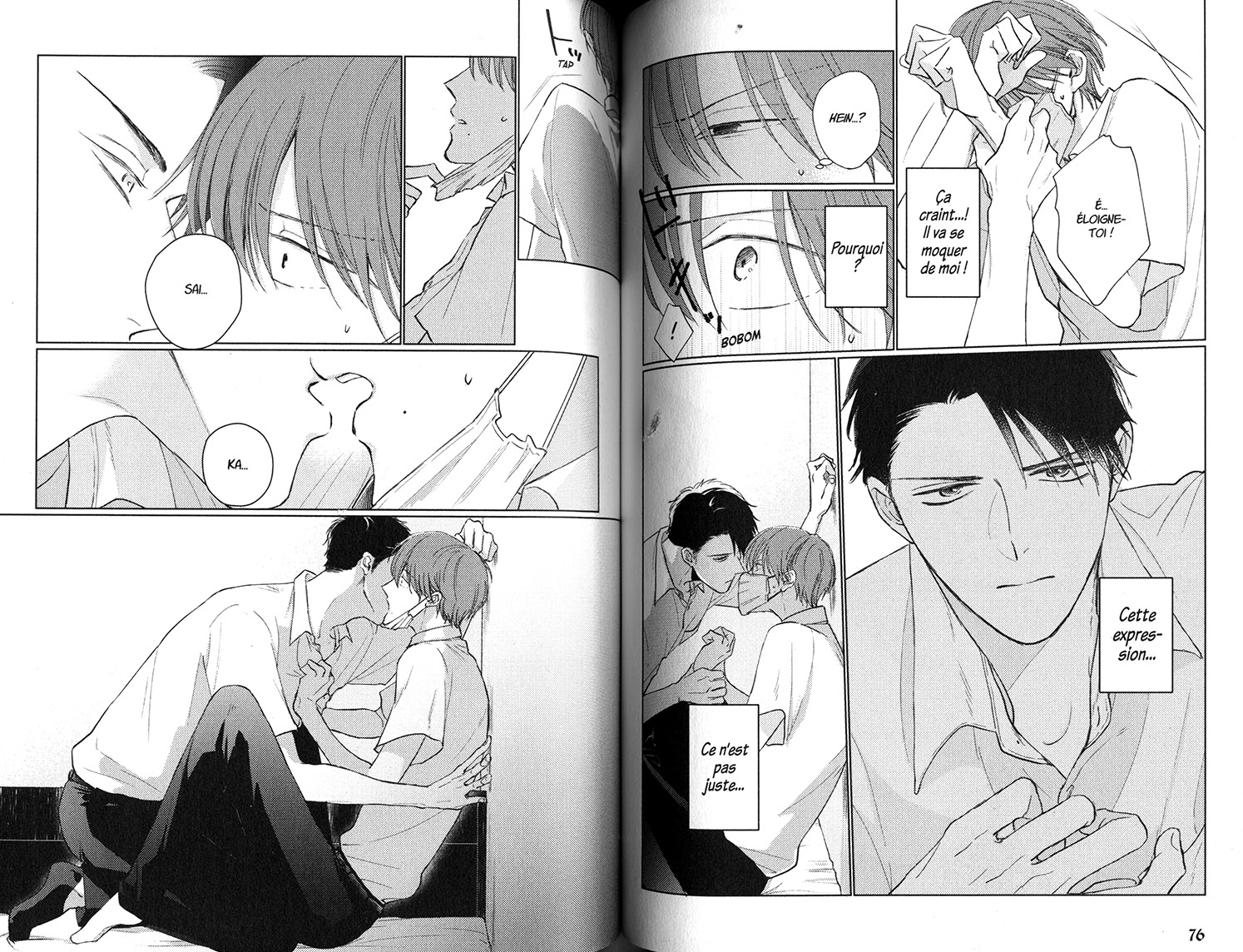 Kakkospokkarissa kilpakosija Tsurugan astuttua kuvioon Saikawa rupeaa toisaalta aika epäterveen ja omistushaluisen mustasukkaiseksi, kun Sayama ja Tsuruga vähän ystävystyvät. Tällainen mustismeininki on minulle usein aika hälyttävä punainen lippu, koska tuntuu siltä, että myrkyllistäkin mustasukkaisuutta käsitellään BL-mangassa edelleen usein romanttisena asiana, ja siksi ne epäterveet puolet jäävät monesti tyystin käsittelemättä (katson sinua, Escape Journey!).